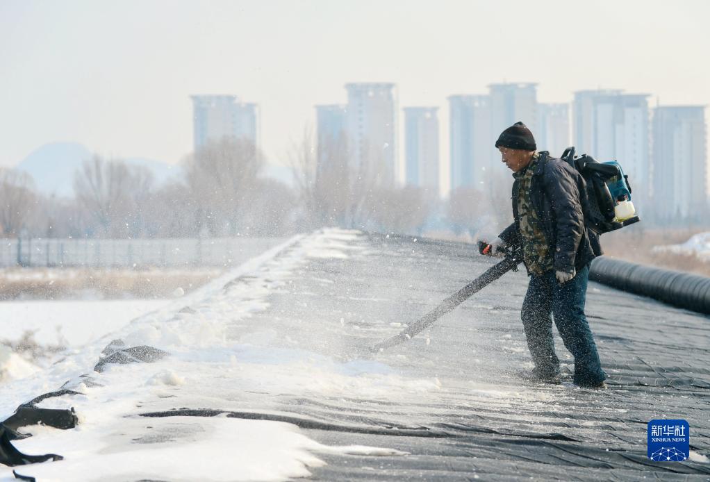 12月18日,石家庄市元氏县南佐村种植户在清理大棚上的积雪。
