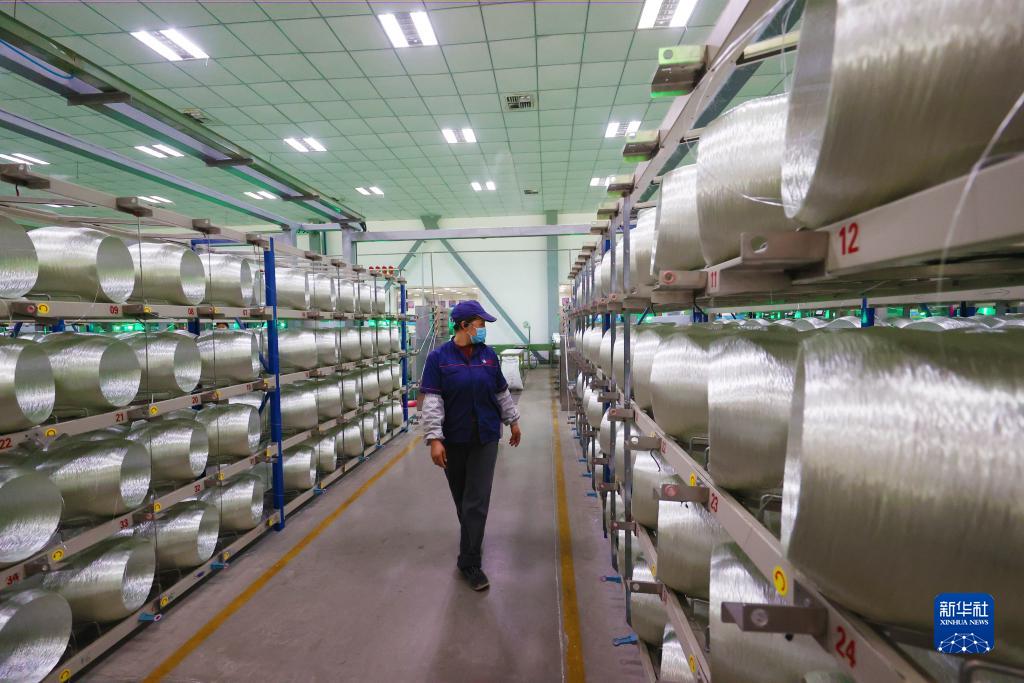 12月18日,在重庆市黔江区三磊玻纤有限公司络纱车间,工作人员在巡视自动化生产线。