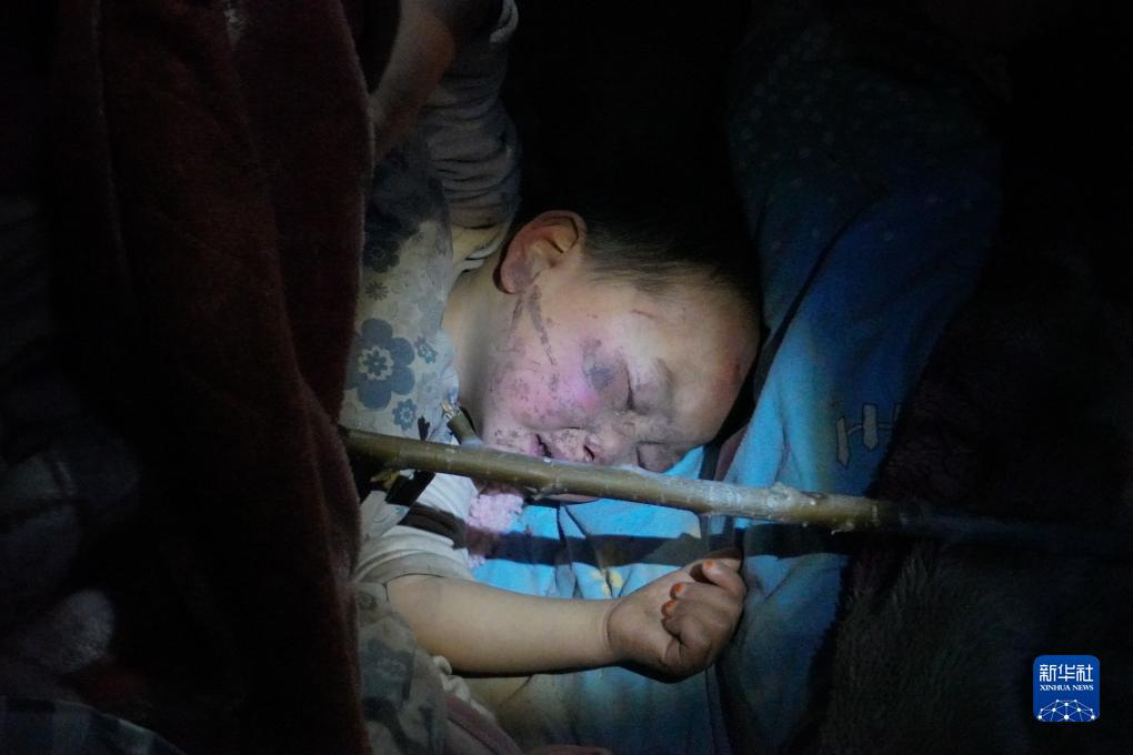 12月19日,在甘肃省临夏回族自治州积石山保安族东乡族撒拉族自治县积石山县中西医结合医院门口,一名受伤儿童得到安置和初步诊疗后熟睡。