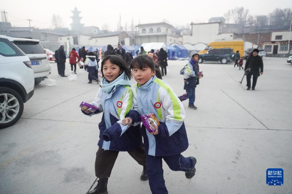 12月19日,在甘肃省临夏回族自治州积石山保安族东乡族撒拉族自治县大河家镇大河村,两名女孩在领取物资。