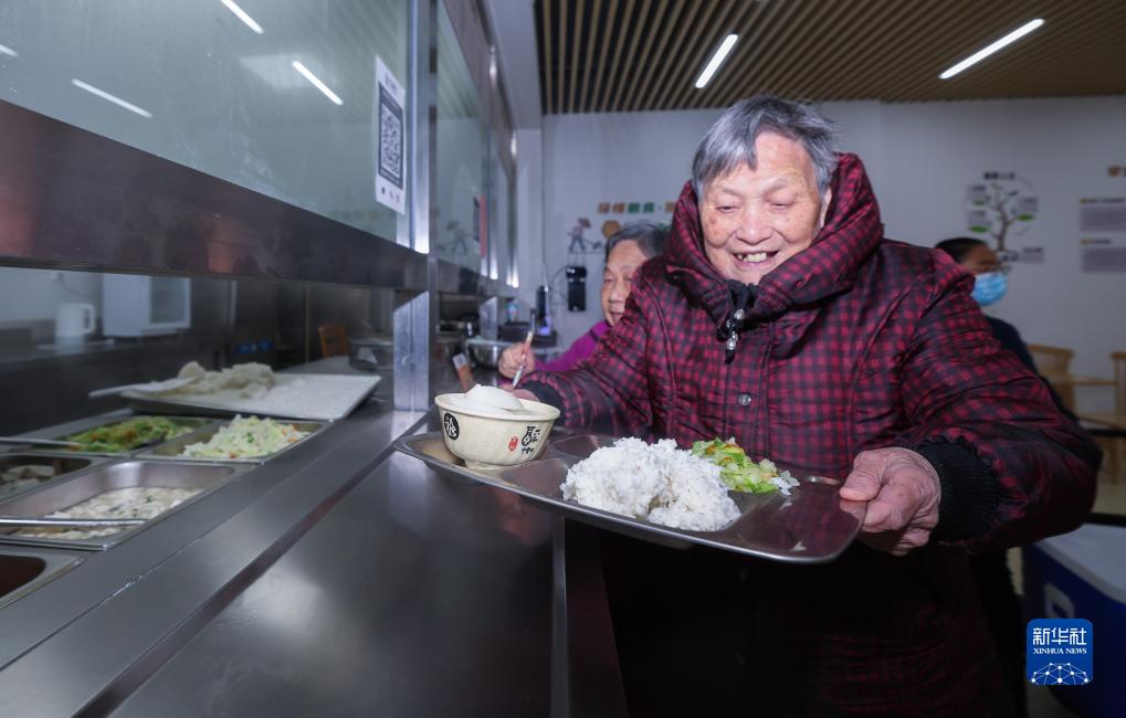 12月19日,在金华市婺城区新狮街道柳湖花园社区居家养老服务照料中心餐厅,老人们在取餐。