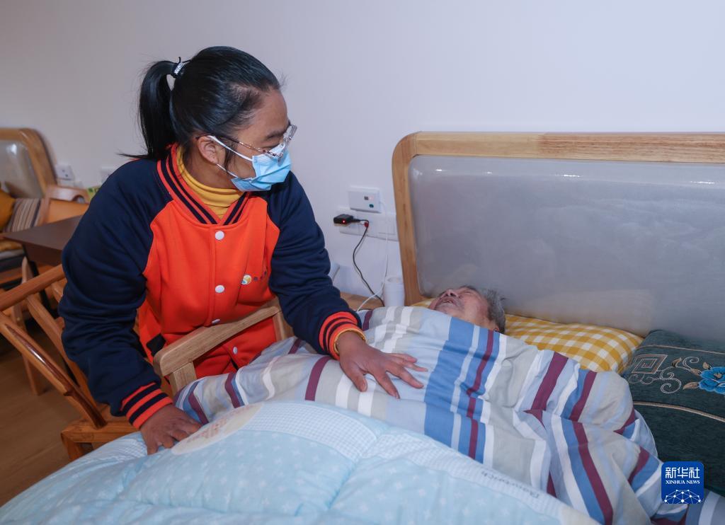 12月19日,在金华市婺城区新狮街道柳湖花园社区居家养老服务照料中心,养老护理员照料行动不便的老人。