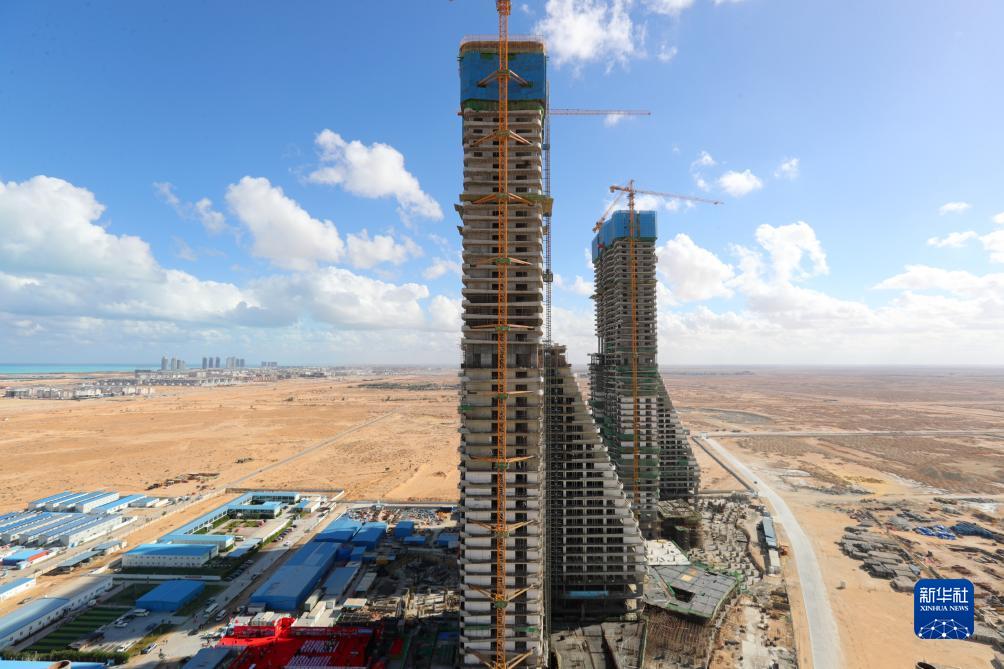 这是12月18日拍摄的埃及阿拉曼新城超高综合体项目率先封顶的D01住宅楼(左)。