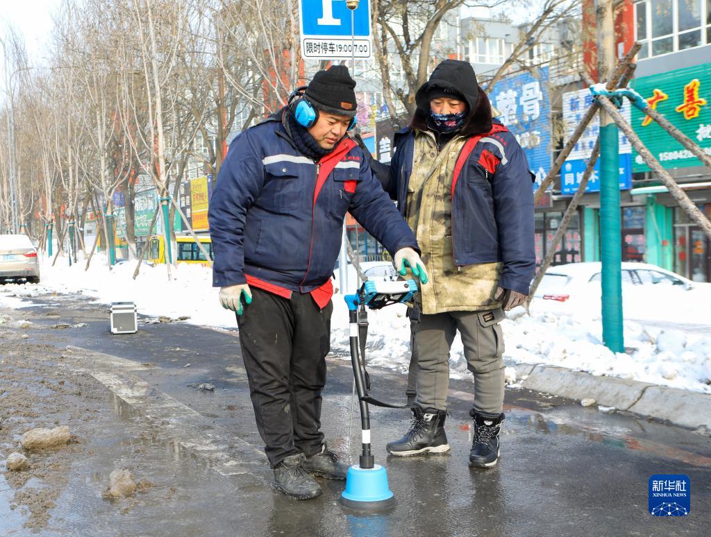 12月19日,沈阳东泰热源的工作人员在沈阳市沈北新区一街道巡查供热管网。