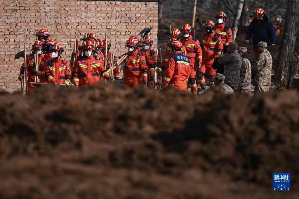 12月19日,救援人员在青海省海东市民和回族土族自治县中川乡金田村清理地震引发的砂涌。