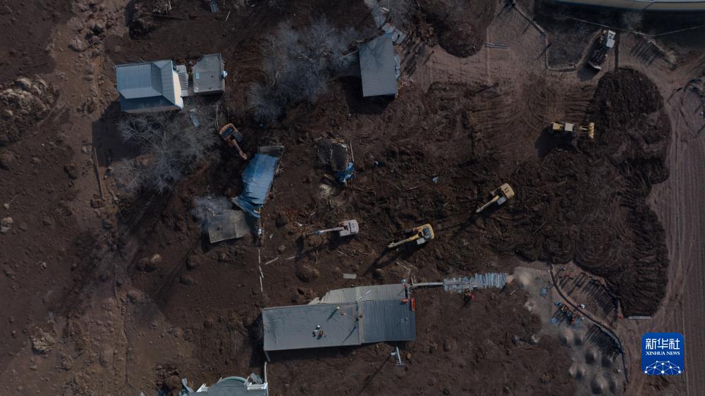 12月19日,救援机械和人员在青海省海东市民和回族土族自治县中川乡金田村清理地震引发的砂涌(无人机照片)。