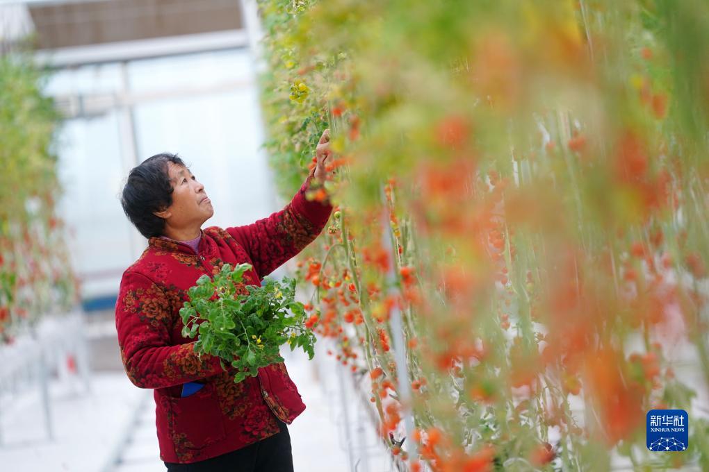 在河北省石家庄市平山县滹沱河高端设施蔬菜示范区育苗中心,大吾乡西沿兴村村民许习云管护小番茄(2023年11月25日摄)。