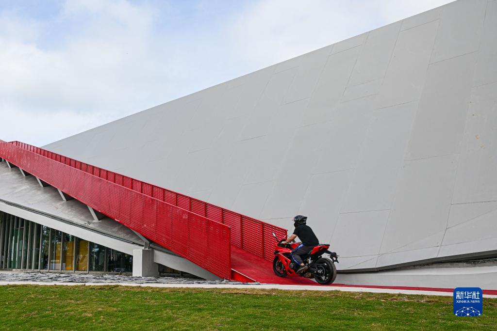 摩托车手在“儋耳追光”驿站摩旅服务中心外骑行(12月15日摄)。