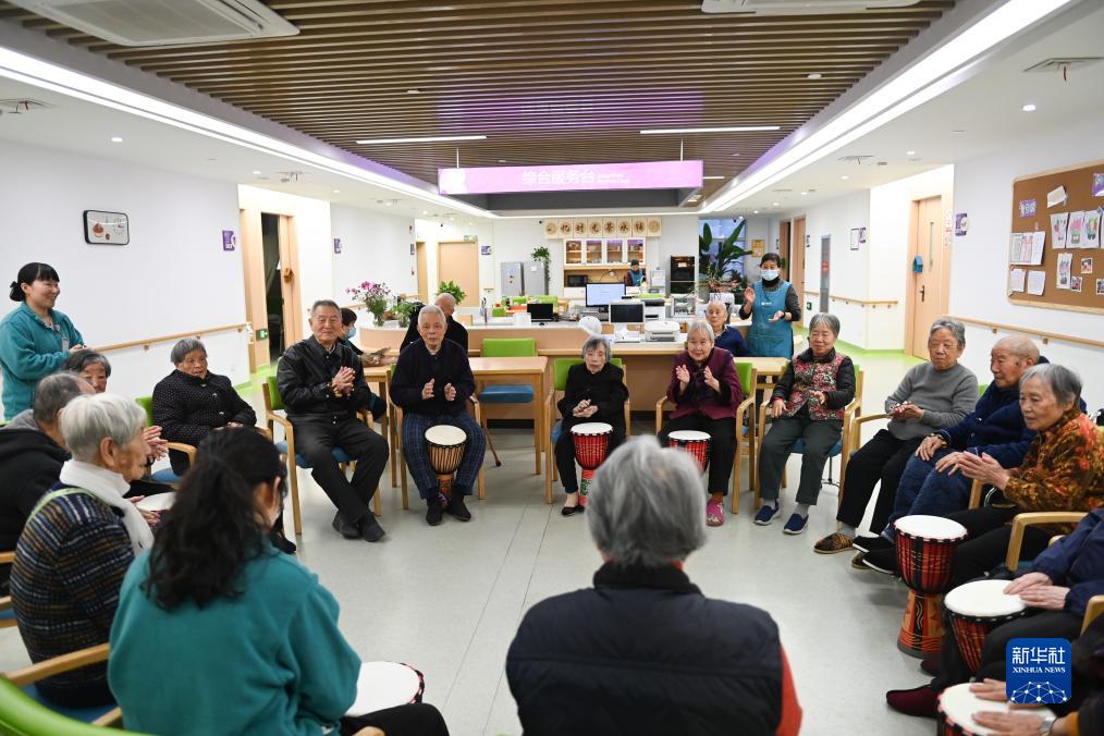 12月19日,在镇海区蛟川街道乐龄长者之家,老人在工作人员的辅助下参加音乐康复训练。