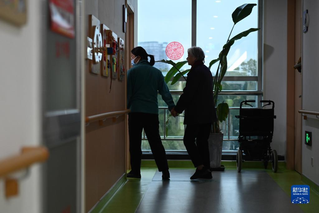 12月19日,在镇海区蛟川街道乐龄长者之家,工作人员(左)牵着老人进入康复训练室。