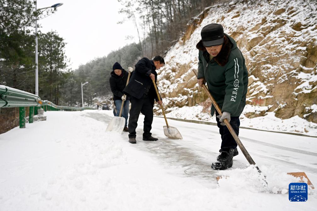 12月19日,安徽省安庆市岳西县天堂镇余安村村民在清理道路积雪。