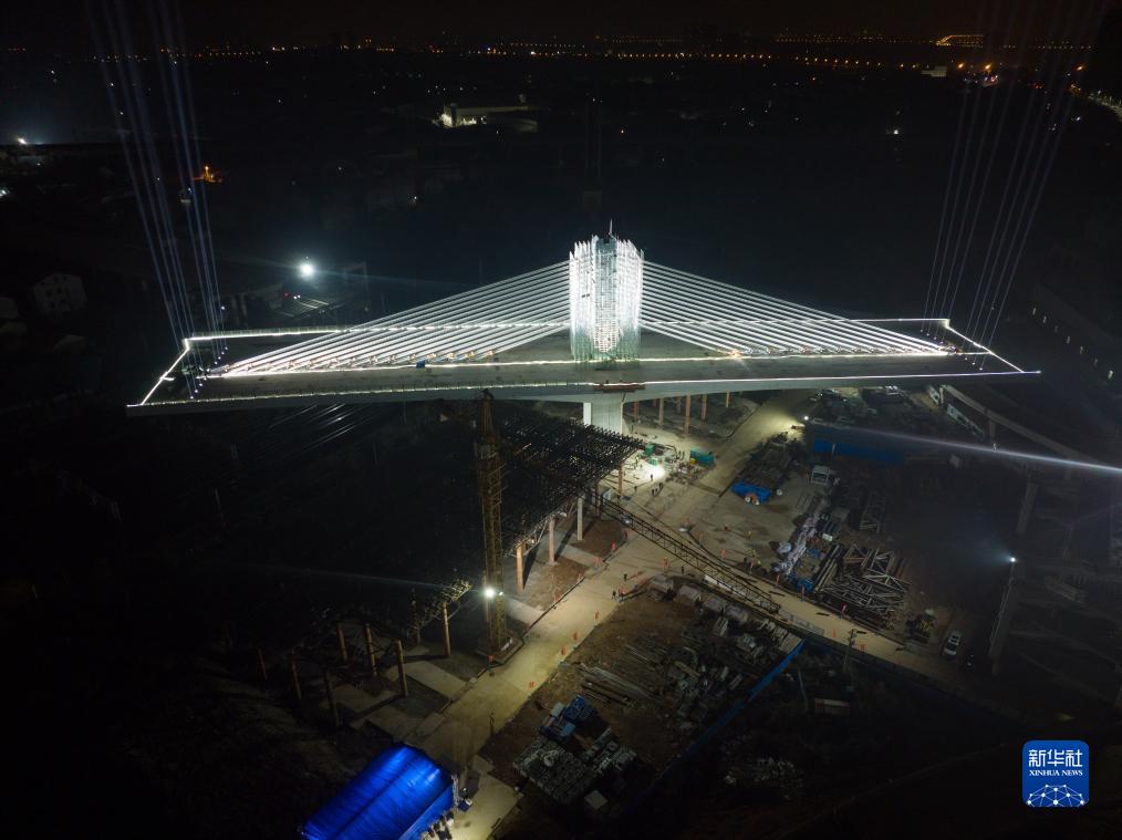12月20日凌晨拍摄的正在进行转体施工的矮塔斜拉桥。