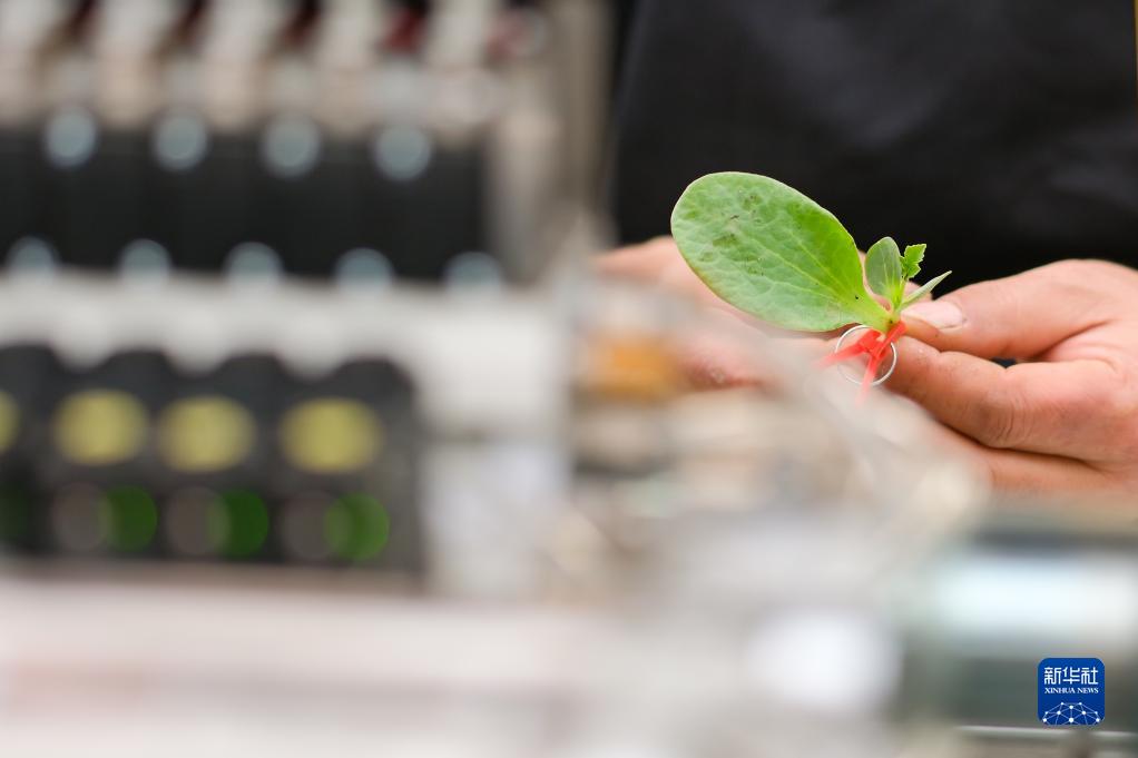 12月19日,工作人员在未来农业科技馆的叶菜工厂示范区展示瓜菜砧木断根嫁接技术。