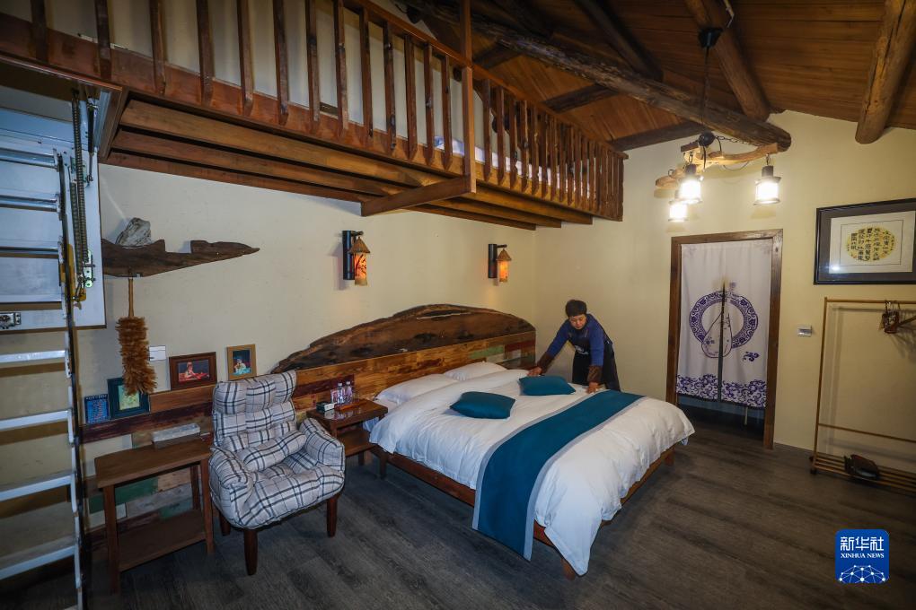12月19日,双合村石里民宿的民宿主张瑛在民宿内整理房间。张瑛和丈夫王代明都是当地渔民,他们将老房子进行改造,成了当地的网红民宿,吸引不少外地客人前来吃饭、住宿。