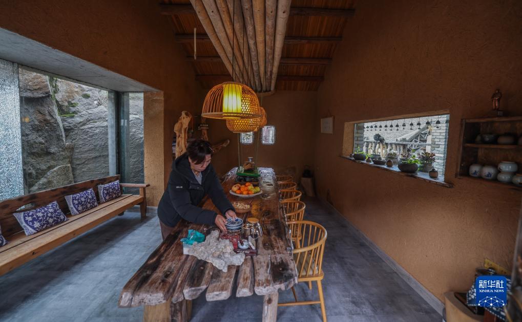 12月20日,双合村的海岛民宿石壁·风铃坡内,工作人员在整理客厅。