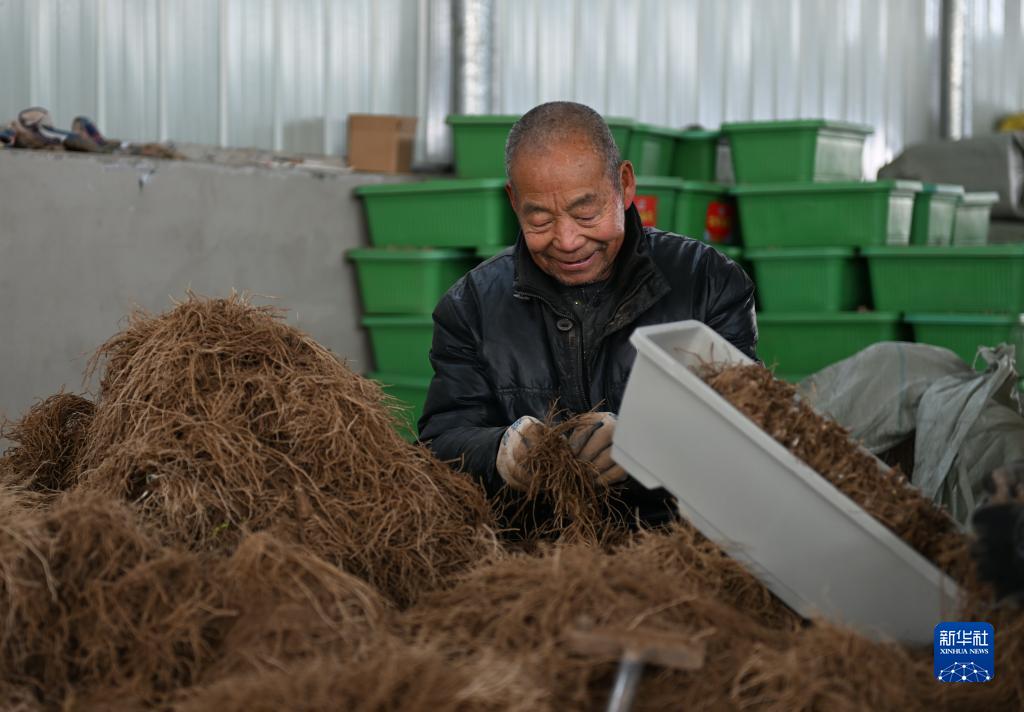 12月20日,河北省南宫市大邢家庄村一处黄韭种植基地的农民在整理盆栽黄韭根脉。