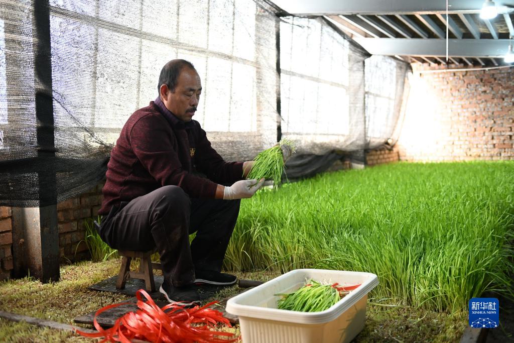 12月20日,河北省南宫市丹绿丰韭菜农民专业合作社的农民在种植棚内采收黄韭。