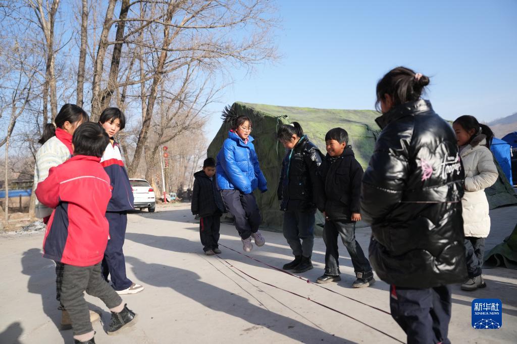 12月20日,在积石山县大河家镇陶家村安置点,小朋友在跳皮筋。