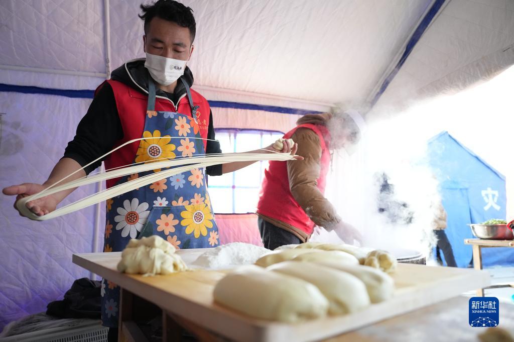 12月20日,在积石山县大河家镇大河村安置点,爱心企业的工作人员为受灾群众制作免费牛肉面。