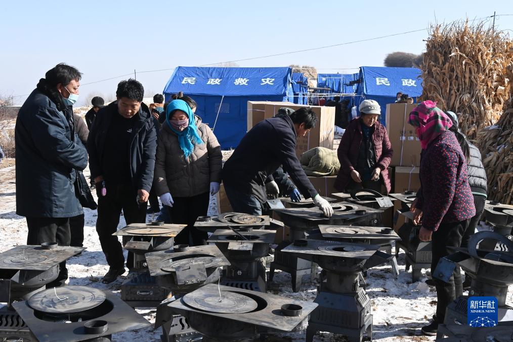 12月20日,在积石山县石塬镇沈家坪村安置点,受灾群众领取火炉。