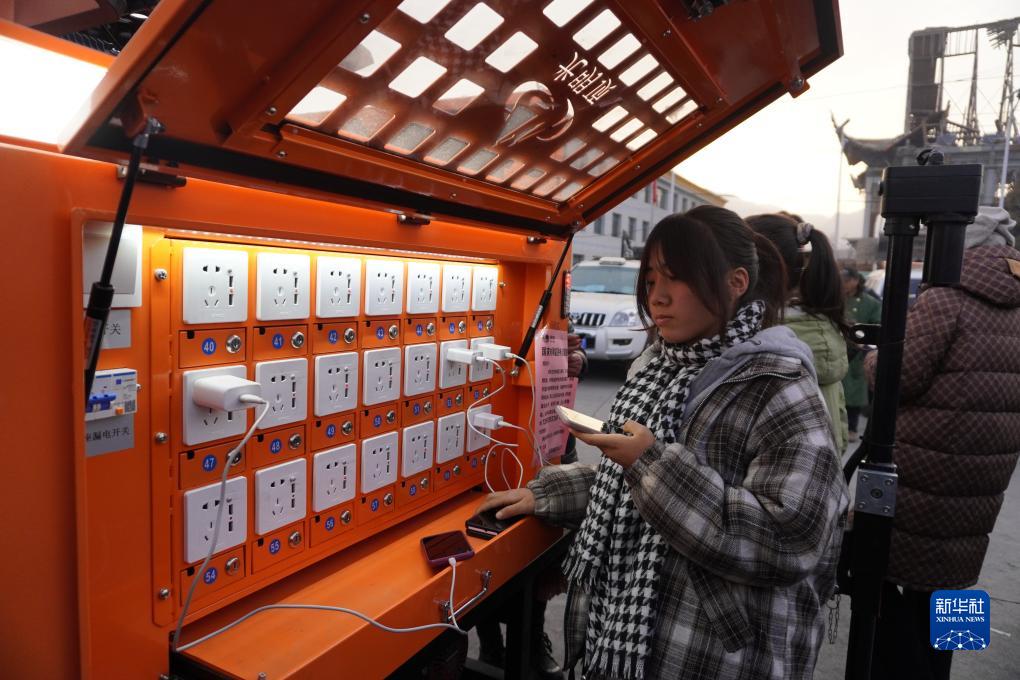 12月20日,在积石山县大河家镇大河村安置点,受灾群众在充电桩前给手机充电。