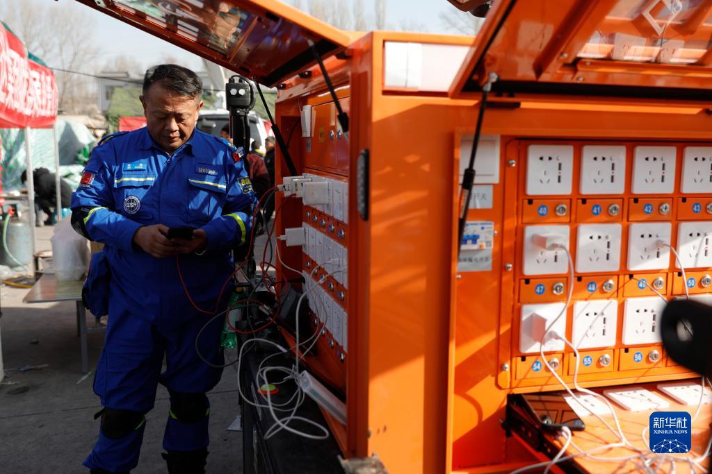 12月20日,在积石山县大河家镇大河村安置点,救援人员在充电站给手机充电。