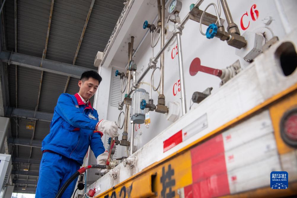 12月20日,在位于重庆市长寿区的供氢中心内,工作人员在为氢气管束车加氢。