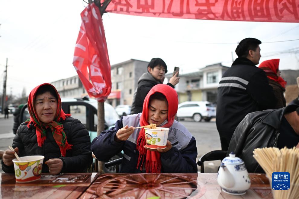 12月20日,在青海省民和县官亭镇,当地群众在拉面摊上吃面。