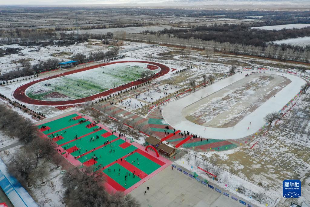 在新疆生产建设兵团第十师一八一团中学,学生参加户外冰雪运动(12月20日摄,无人机照片)。