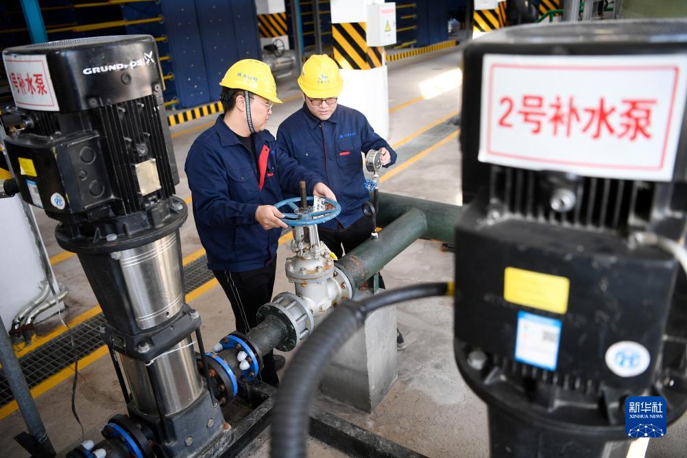 12月21日,宁夏电投热力有限公司工作人员在供暖设备机房巡查。