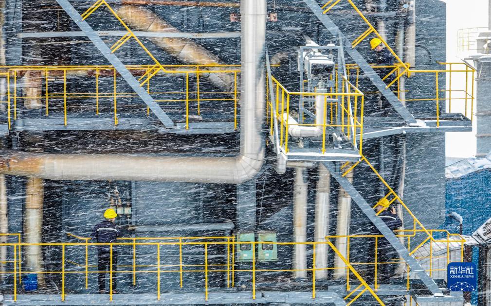 12月21日,在山东省荣成市热电厂,工作人员进行供暖设备巡检(无人机照片)。