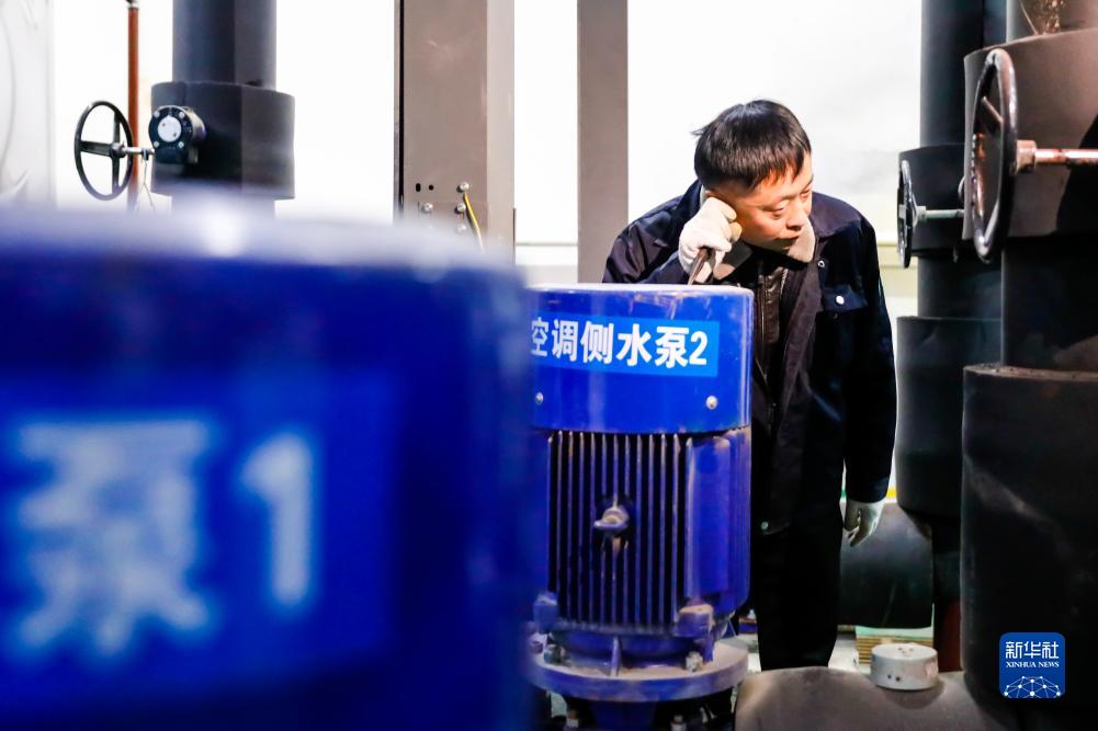 12月21日,在河南省焦作市武陟县中医院供暖机房,工作人员对供暖设备进行每日例行检查。