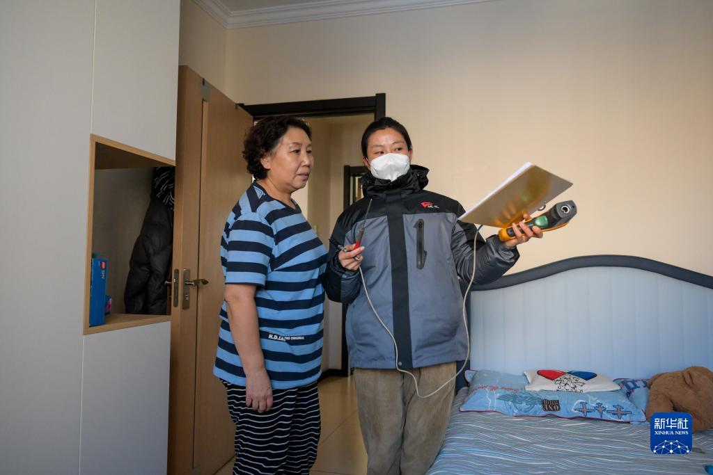 12月21日,呼和浩特市城发供热有限责任公司桥靠分公司工作人员(右)在玉锦轩小区一户居民家测温。