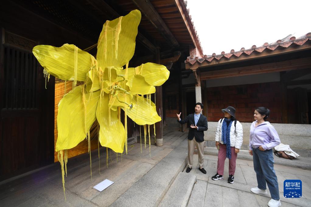 12月19日,福建晋江梧林村闽南古民居德鑨三间张内,梧林艺术季策展人、归侨后代吴少鹏(左)向游客介绍他的装置艺术作品。