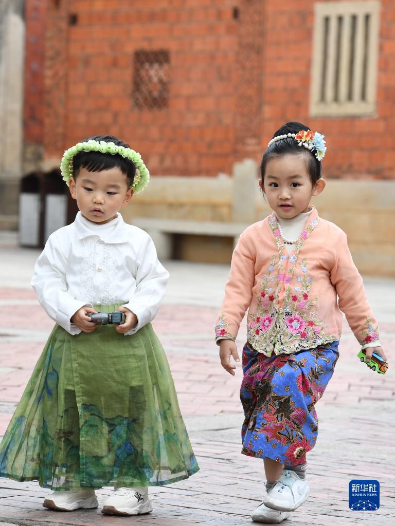 12月19日,两名小游客在福建晋江梧林村玩耍。