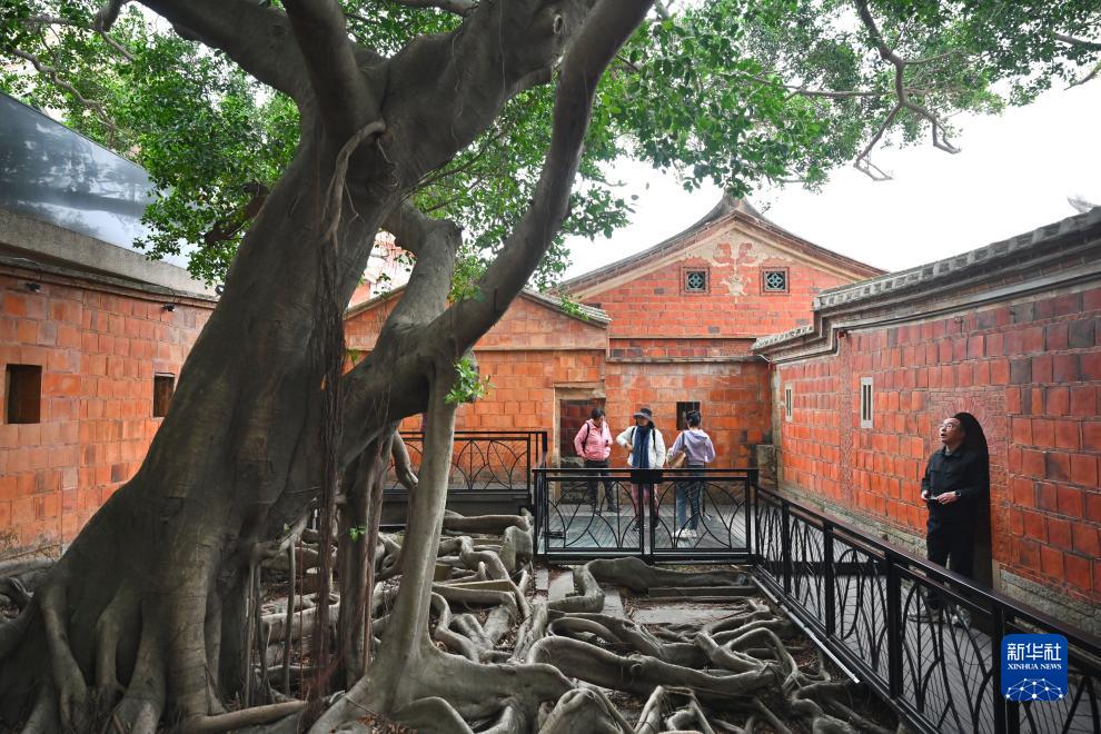 12月19日,游客在福建晋江梧林村闽南古民居德卫宅内参观古榕树。