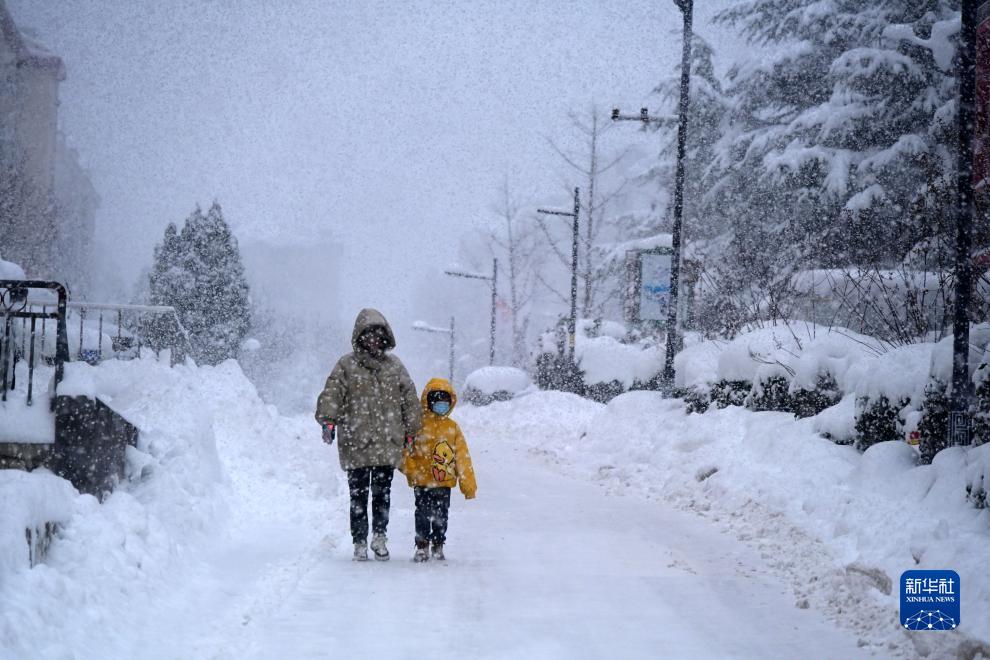 12月21日,市民在山东省荣成市街头冒雪出行。