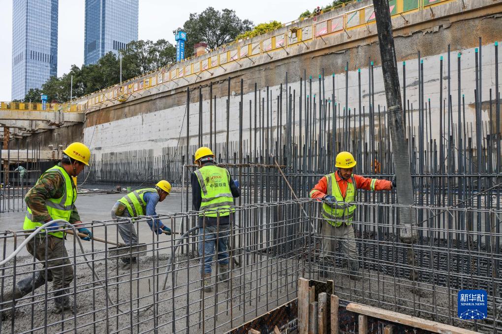 12月21日,施工人员在穗莞深城际铁路前皇段深圳中心公园存车场浇筑混凝土底板。