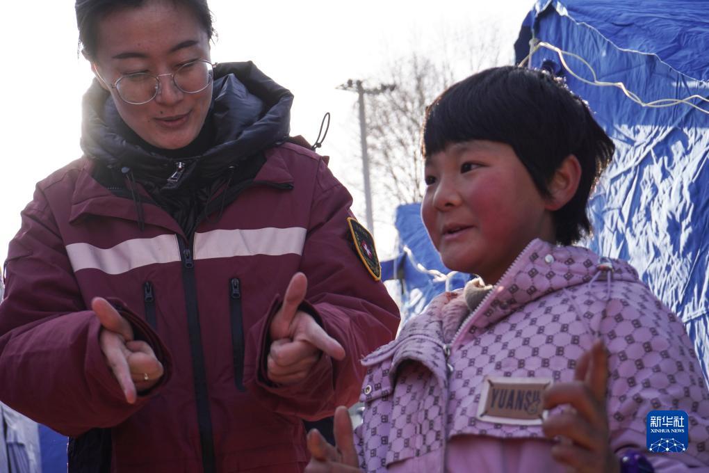 12月21日,在甘肃省临夏州积石山县刘集乡阳洼村的一处临时安置点,甘肃省心理救援队队员带着孩子做游戏。