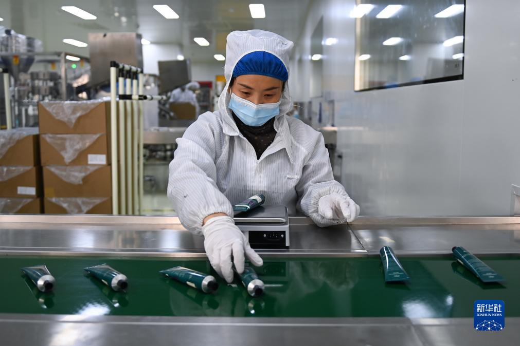 12月21日,工人在“美妆小镇”内一家化妆品生产企业的护手霜灌装车间作业。