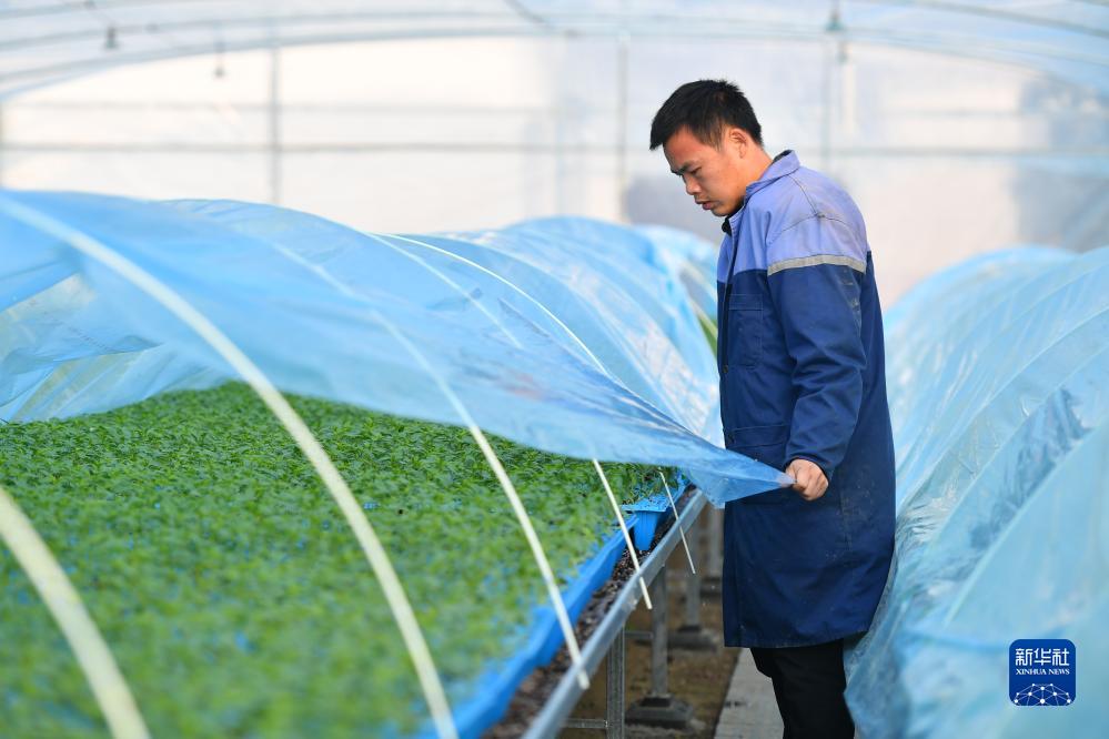 12月21日,在长沙市望城区靖港镇的一处蔬菜大棚种植基地,农户为蔬菜苗加盖薄膜保温。