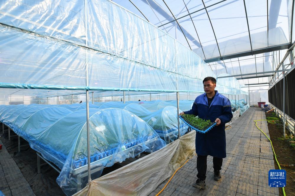 12月21日,在长沙市望城区靖港镇的一处蔬菜大棚种植基地,农户在搬运蔬菜苗。