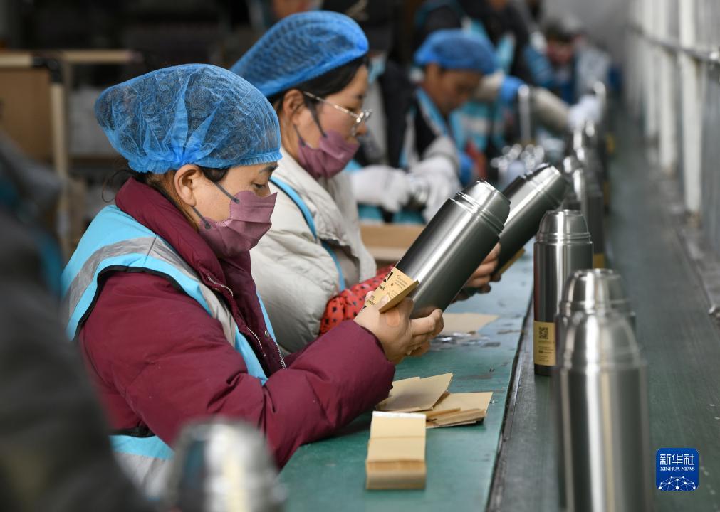 12月21日,浙江省永康市一家保温杯生产企业车间内,工作人员给即将出厂外销的保温杯贴标签。