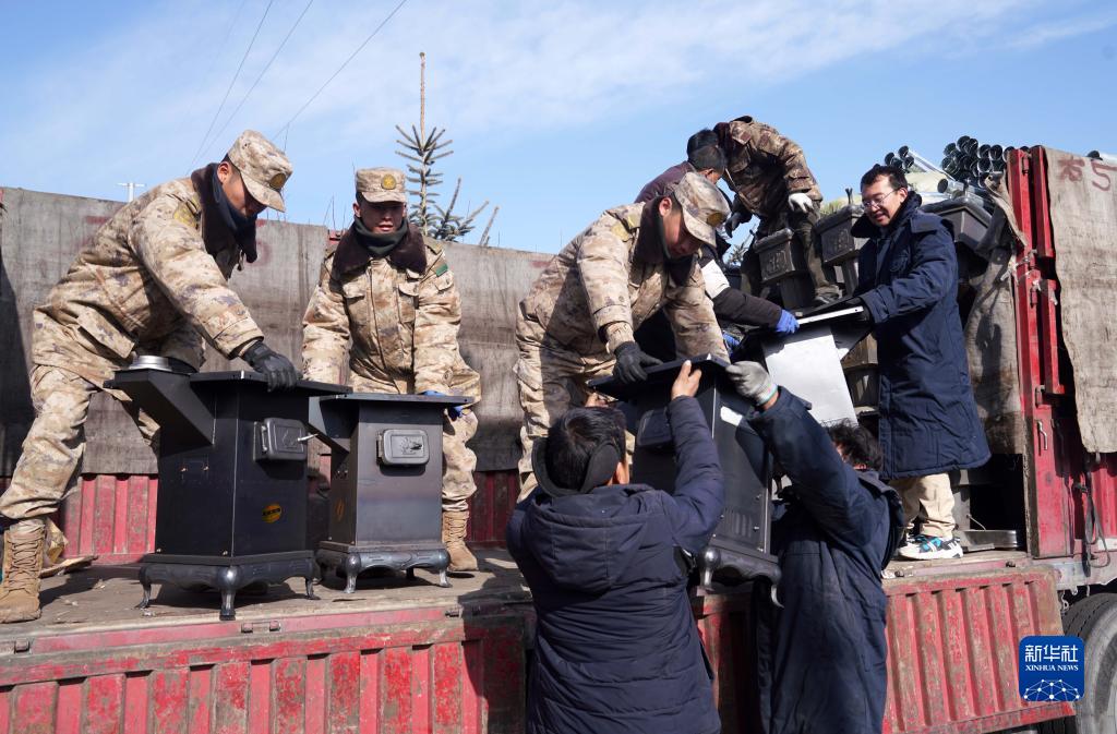 12月21日,陆军第76集团军某旅官兵在积石山县石塬镇安置点与受灾群众一起卸载取暖炉。