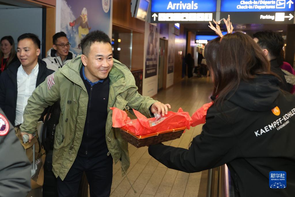 12月21日,在卢森堡芬德尔国际机场,工作人员(右前)向中国卢森堡客运直航首航乘客送上欢迎礼品。