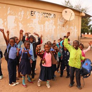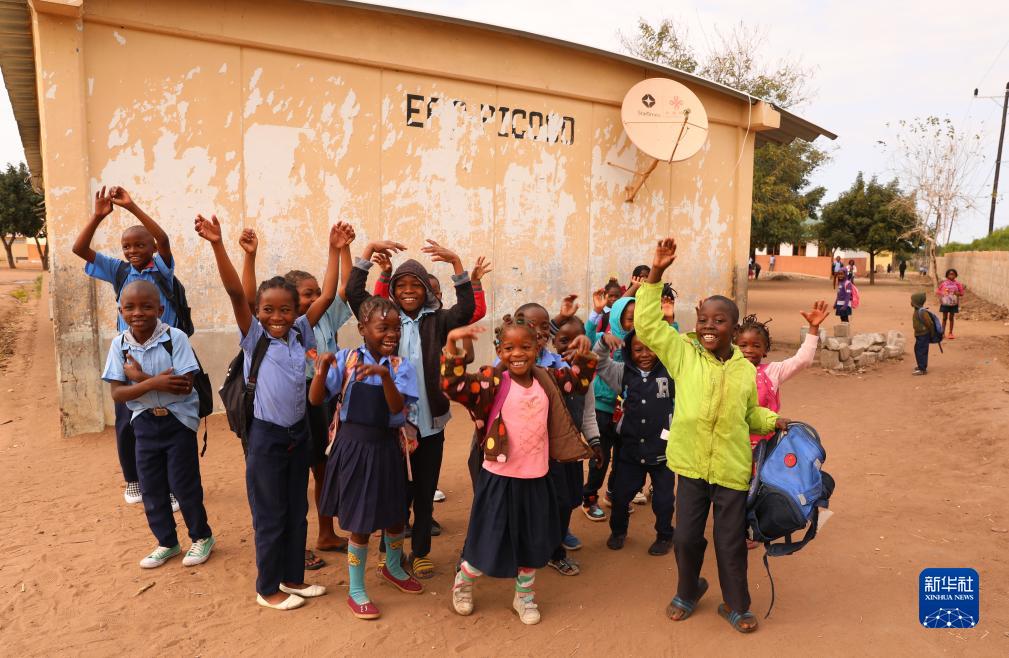 2023年7月25日,莫桑比克马普托省皮科科村学校的孩子们站在装有中国援助的卫星电视接收天线的房屋前。“万村通”项目旨在为非洲国家的1万个村庄接入卫星数字电视信号,项目2018年在莫桑比克启动,为该国1000个村落、2万户家庭和3000个公共场所安装卫星电视设备,提供电视信号和节目,覆盖农村人口达250万。