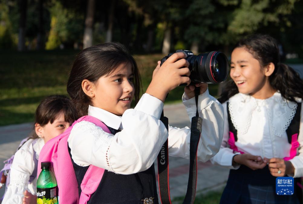 2023年9月15日,在乌兹别克斯坦撒马尔罕,一名女孩使用记者的相机拍照。今年9月,新华社“一带一路全球行”大型活动正式启动,以行进式报道的方式,穿越15个国家,就“一带一路”10年来的发展成就进行观察。这是记者在途中拍摄的照片。