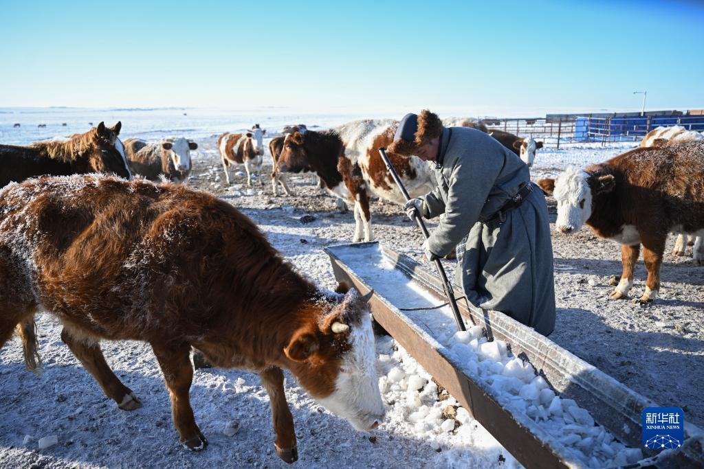12月16日,额尔敦达来粉碎并清理水槽里的冰块,以便给牲畜饮水。