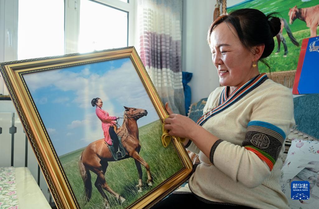 12月16日,额尔敦达来的妻子阿力玛在家中擦拭女儿的照片。