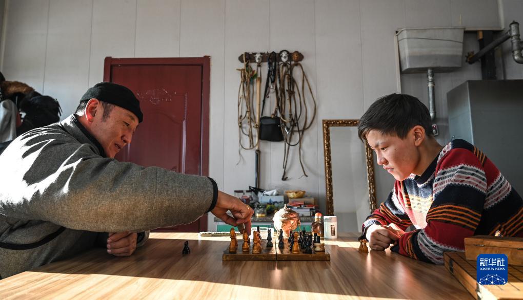 12月16日,额尔敦达来(左)和伊吉力在家中下国际象棋。